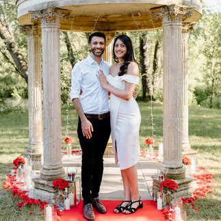 The idea of the proposal is to have a red-carpet walkway leading up to the pagoda, we will have candles, fairy lights, petals, and vases or red roses spaced out on either side of the red carpet. The pagoda pillar will be wrapped with fairy lights, as well as around the bottom, in between the pillars we will sprinkle red petals, tea lights, and vases or red roses.